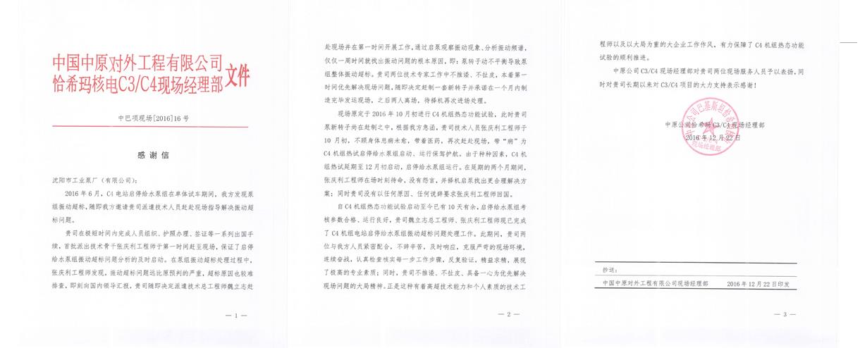 尤其是近期,巴基斯坦現(xiàn)場邀請我公司技術(shù)人員到現(xiàn)場指導解決C4項目電站啟停給水泵單體試車,我公司人員緊密配合,及時響應(yīng),克服苛刻的現(xiàn)場環(huán)境,嚴謹精益求精的工作態(tài)度,有力的保障了C4機組熱態(tài)功能試驗的順利推進,現(xiàn)C4項目機組熱態(tài)功能試驗已正常啟動,啟停給水泵組考核參數(shù)合格、運行良好。中原公司恰希瑪C3/C4項目經(jīng)理部對我公司服務(wù)人員極高的專業(yè)素質(zhì)和企業(yè)不推委、不扯皮,一心為優(yōu)先解決現(xiàn)場問題以大局為重的企業(yè)工作作風表示真誠的感謝,特為我公司發(fā)來感謝信!