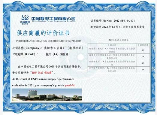 沈陽市工業(yè)泵廠(有限公司)獲得中國(guó)核電工程有限公司4A供應(yīng)商履約評(píng)價(jià)